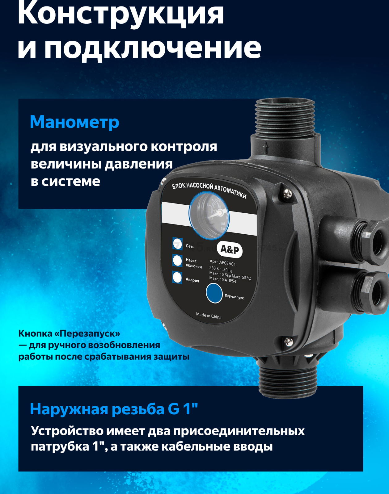 Блок автоматики A&P (AP03A01) предназначен для автоматизации работы электронасоса, защищает его от работы без воды (сухого хода). Обеспечивает запуск при понижении давления (открытие кранов) или остановку при отсутствии водного потока в системе водоснабжения (закрытие кранов).