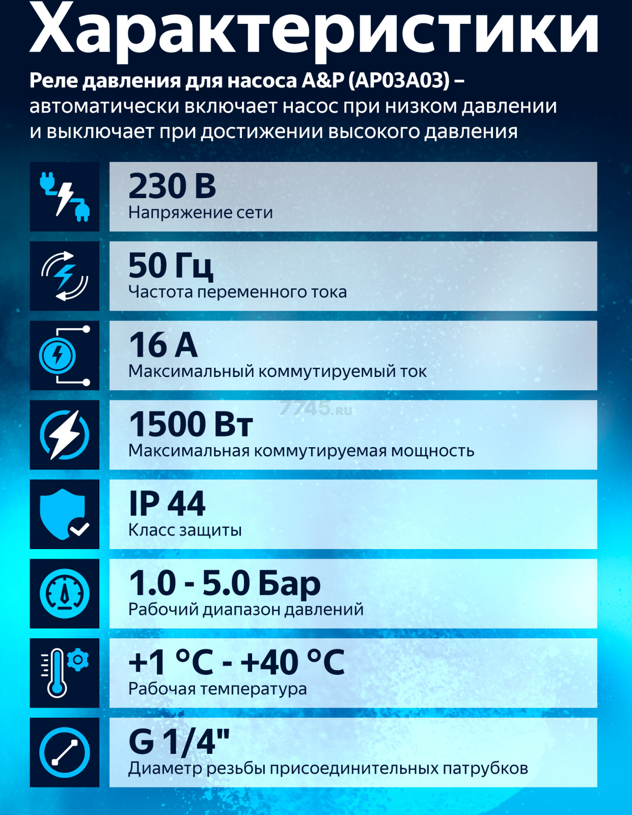Реле давления для насоса A&P (AP03A03) состоит из корпуса, внутри которого расположена нормально замкнутая контактная группа, управляемая мембраной, соединенной с напорной магистралью. Реле включает насос, когда давление в системе падает ниже установленного значения и выключает насос, когда давление в системе достигает установленного значения выключения.