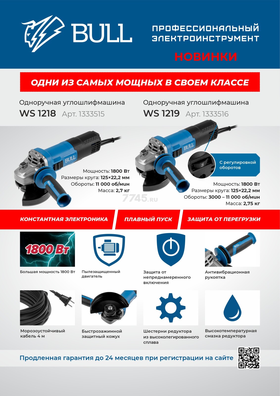 Информация о товаре Шлифмашина угловая (болгарка) BULL WS 1219 (1333516)