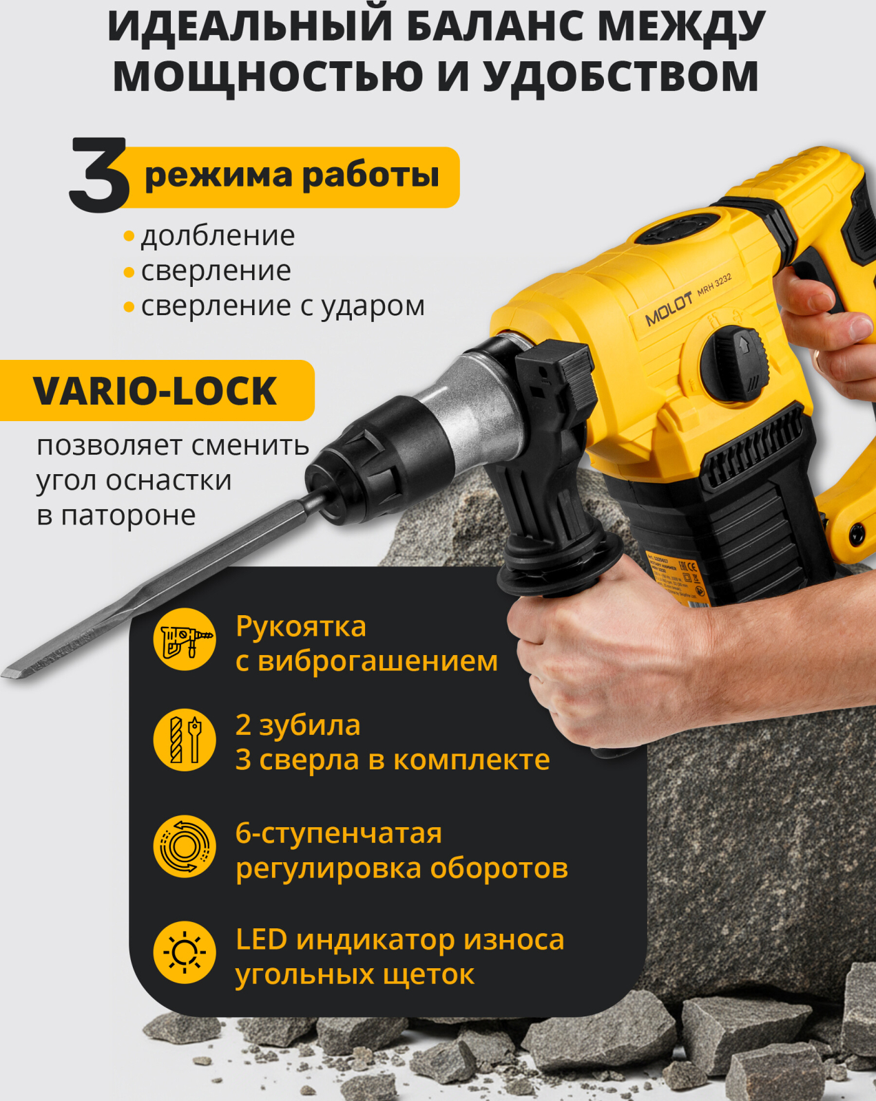 Перфоратор MOLOT MRH 3232 (1325617) - инструмент бытового класса, предназначенный для использования в трёх режимах: сверление, сверление с ударом, долбление. Мощный двигатель 1500 Вт и сила удара 5 Дж позволяют достигать высокой производительности и делать отверстия в бетоне диаметром до 32 мм. Функции регулировки оборотов и выбора угла оснастки (Vario-lock) помогут подобрать оптимальный режим работы в зависимости от вида задачи и обрабатываемого материала. Модель также оснащена антивибрационной рукояткой для обеспечения комфорта пользователя во время работы и LED индикатором износа угольных щеток, который позволит осуществить своевременную замену щеток. В комплекте имеются 3 сверла и 2 зубила.