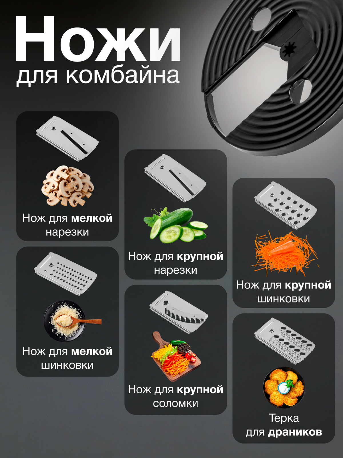 В комплект входят ножи из нержавеющей стали: для крупной и мелкой шинковки, для крупной и мелкой нарезки, для нарезки соломкой, терка для приготовления драников.