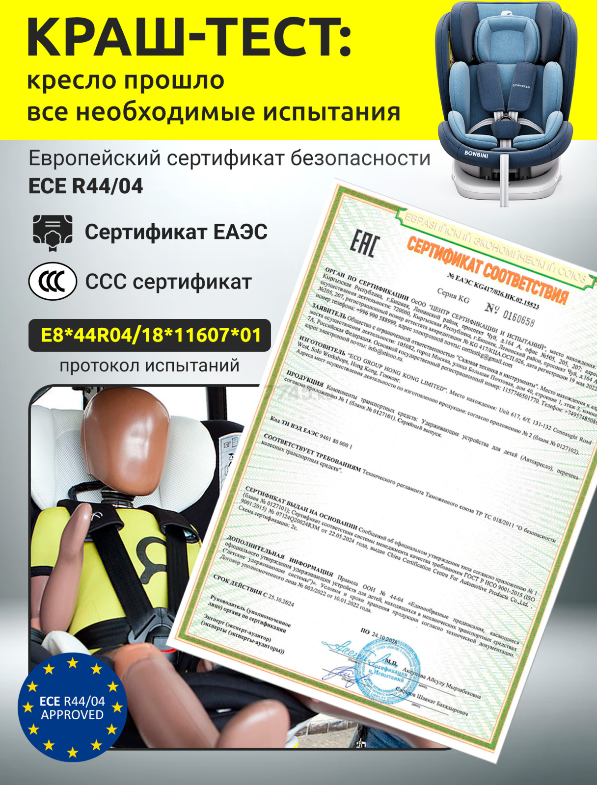 Автокресло BONBINI Universe Blue melange (BO-3231123) - это надежное и безопасное решение для перевозки детей в автомобиле с рождения до 12 лет. Автокресло BONBINI Universe одобрено в соответствии с требованиями Европейского стандарта по средствам безопасности детей ECE R44/04. Также соответствует стандарту ЕАЭС. Каждая модель прошла все необходимые краш-тесты.