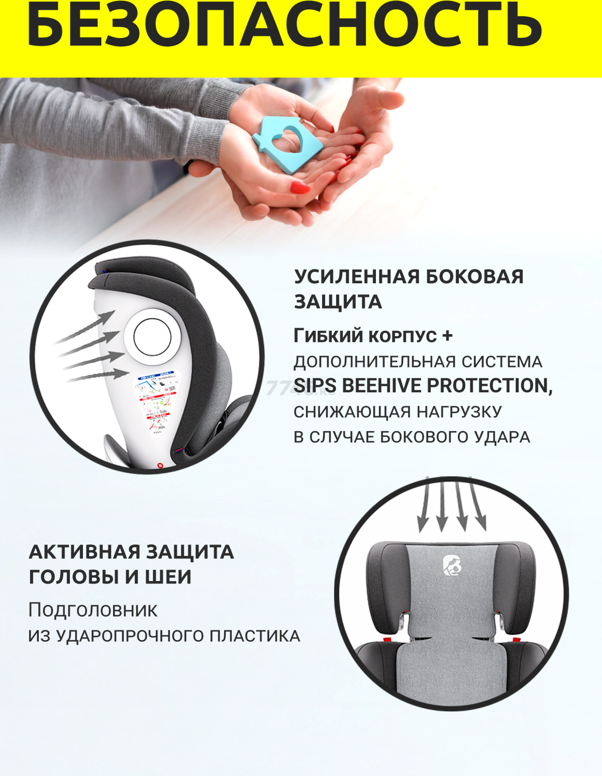 - Автокресло для детей имеет текстильную обивку, которая приятна на ощупь и легко чистится.