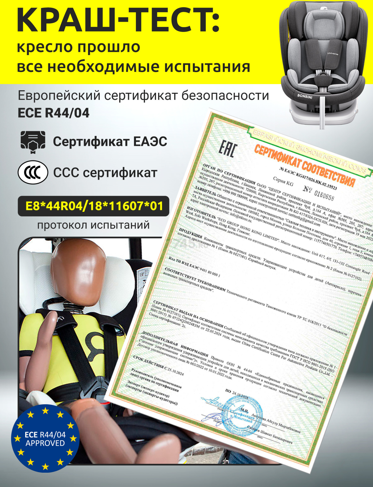 | Стандарты безопасности | ECE R44/04 |