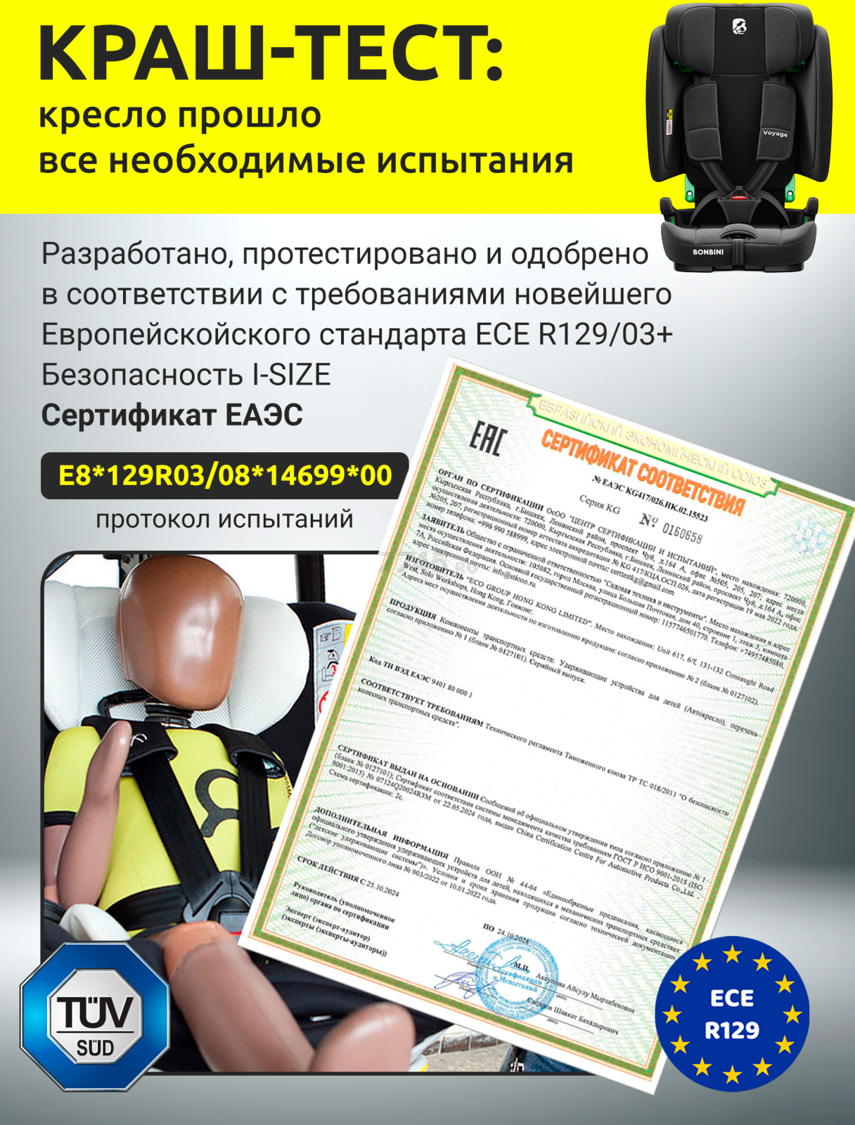| Стандарты безопасности | ECE 129 (i-Size) |