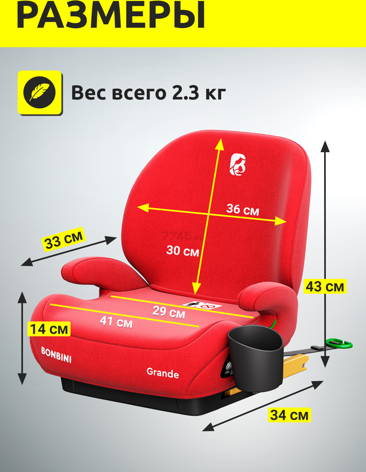 Размеры: высота спинки 30 см; ширина спинки 36 см; размеры посадочного места 29-33; высота бустера со спинкой 43 см; высота сиденья без спинки 14 см.