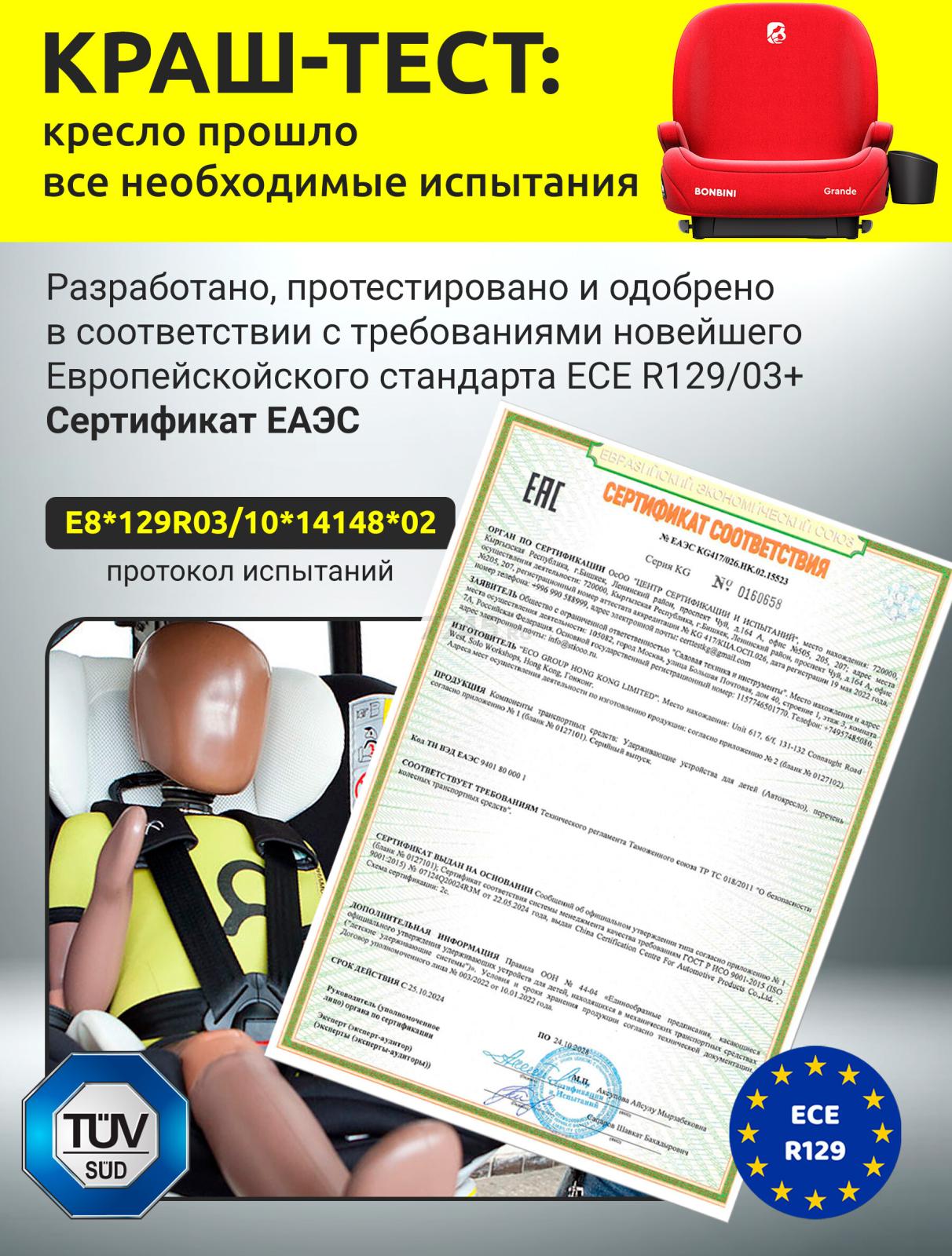 Автокресло-бустер BONBINI Grande Coral Red melange (BO-3231118) - предназначено для перевозки детей ростом от 125 до 150 см и устанавливается в автомобиле только по ходу движения. Автокресло бустер BONBINI Grande разработано, протестировано и одобрено в соотвествии с требованиями Европейскойского стандарта по средствам безопасноти детей ECE R129/03. Также соответсвует стандарту ЕАЭС. Каждая модель прошла все необходимые краш-тесты.