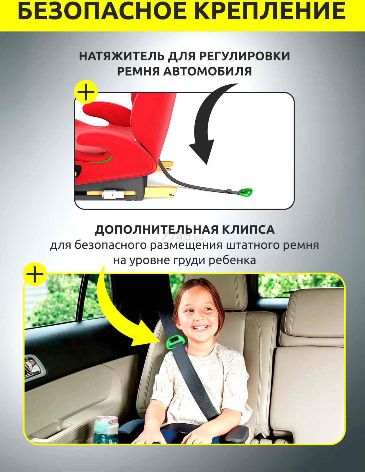 - съемная спинка, которая не только увеличивает комфорт в поездках, но и повышает уровень безопасности. Спинка закрывает зазор между бустером и сиденьем и обеспечивает плотное прилегание поясницы ребенка к автокреслу.