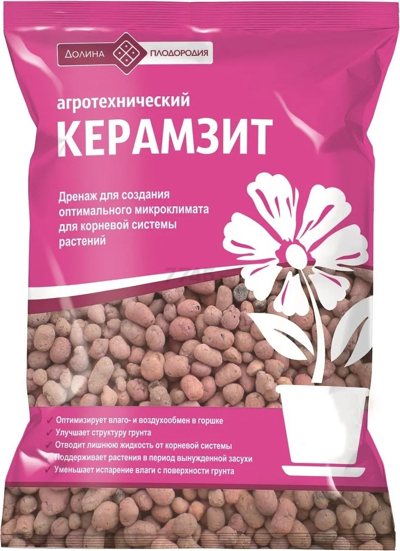 Дренаж ДОЛИНА ПЛОДОРОДИЯ Керамзит 20 л предназначен для создания оптимального климата для корневой системы растений. Оптимизирует воздухо- и влагообмен в горшке. Улучшает структуру грунта. Отводит лишнюю жидкость от корневой системы. Поддерживает растения в период вынужденной засухи. Уменьшает испарения влаги с поверхности грунта.