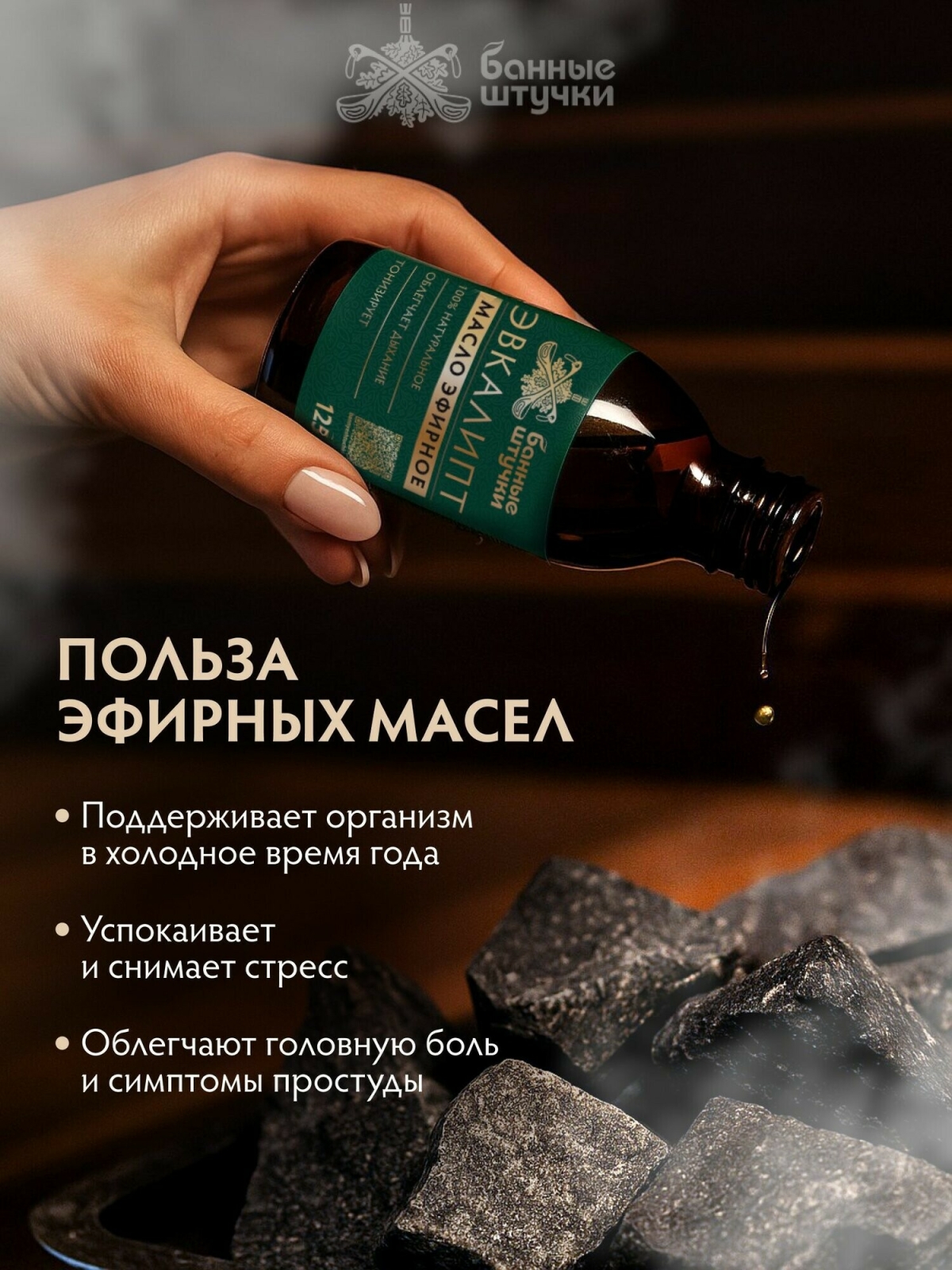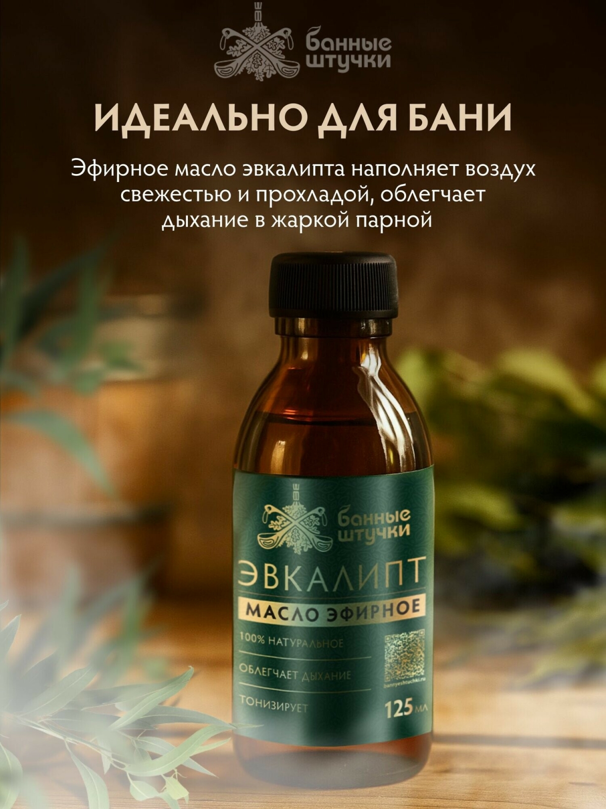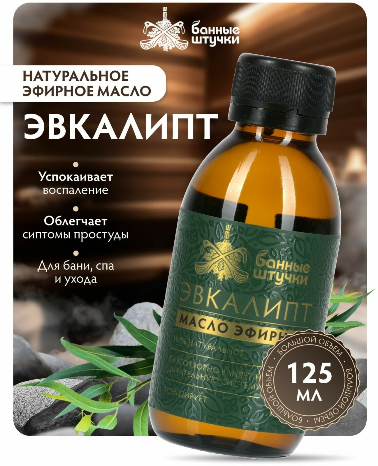 Эфирное масло БАННЫЕ ШТУЧКИ Эвкалипт 125 мл (32822) натуральное эфирное масло эвкалипта для бани и сауны. Ароматное эфирное масло поднимет настроение, создаст атмосферу спокойствия и гармонии. Когда вы добавите несколько капель масла на раскаленные камни или в горячую воду, ароматные запахи, смешиваясь с разогретым воздухом, создадут особую атмосферу. Смягченный и ароматизированный воздух облегчит дыхание, благотворно повлияет на кожу. Хранить отдельно от пищевых продуктов при температуре не выше 25 градусов. Состав: 100% натуральное эфирное масло эвкалипта.