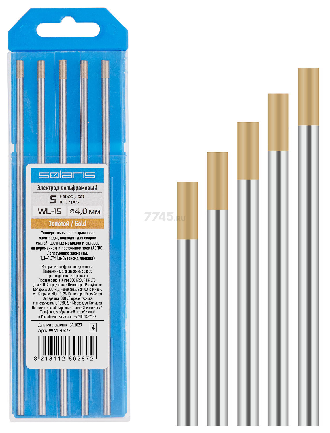 Электрод вольфрамовый для TIG сварки 4 мм SOLARIS WL-15 золотой 5 штук (WM-4527)
