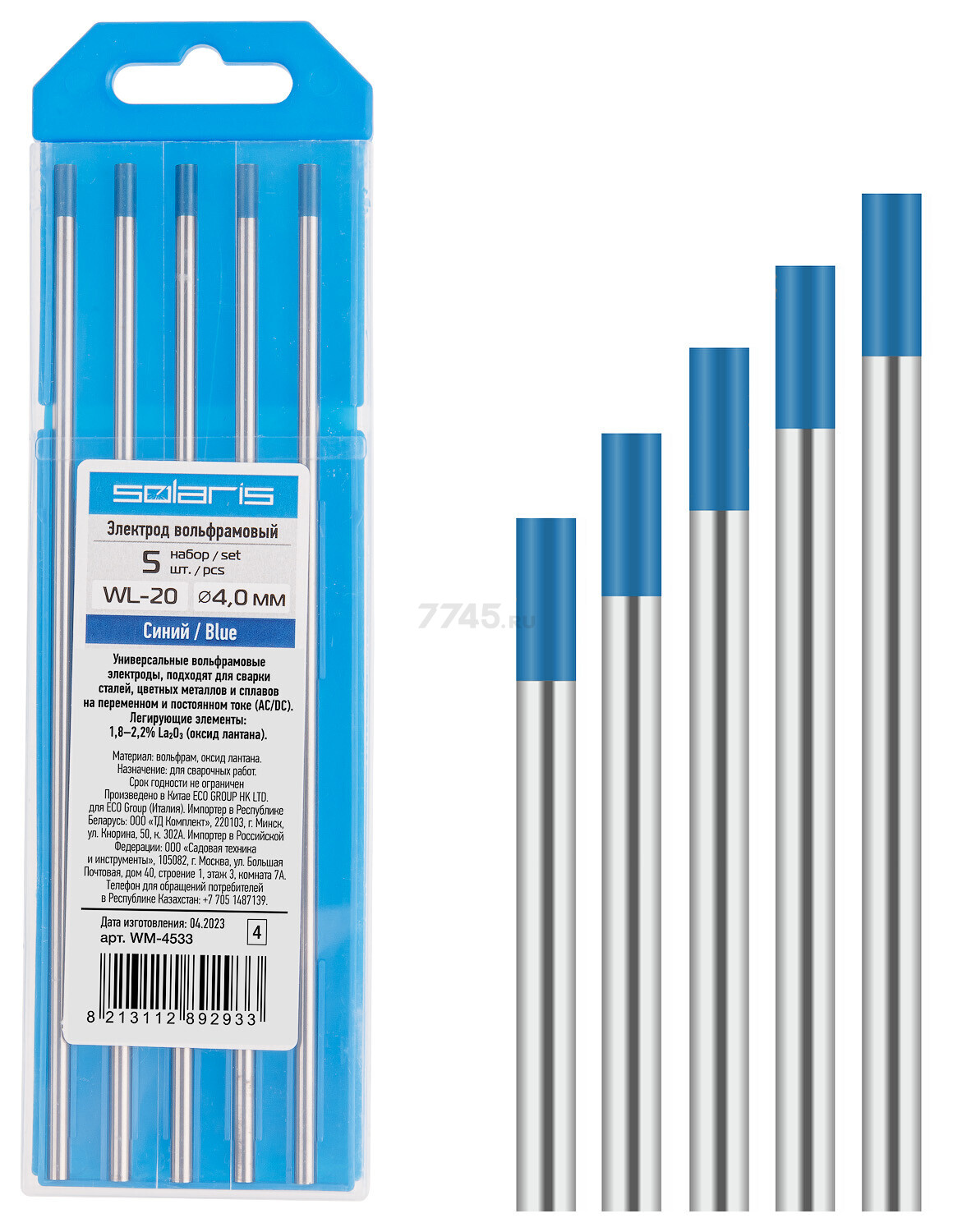 Электрод вольфрамовый для TIG сварки 4 мм SOLARIS WL-20 синий 5 штук (WM-4533)