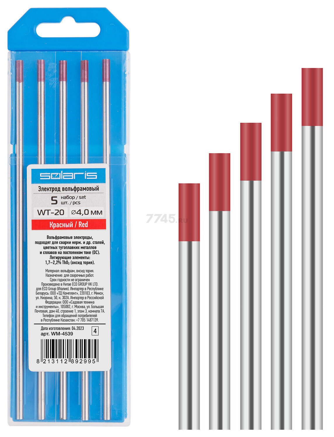 Описание товара Электрод вольфрамовый для TIG сварки 4 мм SOLARIS WT-20 красный 5 штук (WM-4539)