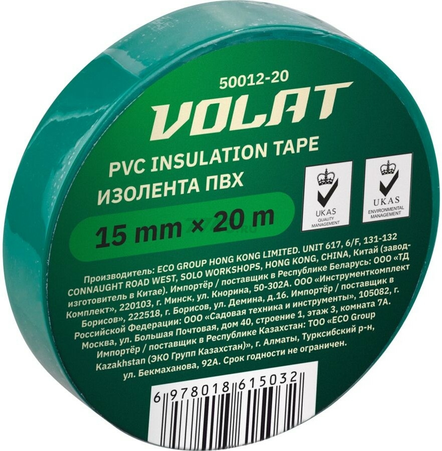 Описание товара Изолента ПВХ 15 мм 20 м ВОЛАТ зеленая (50012-20)