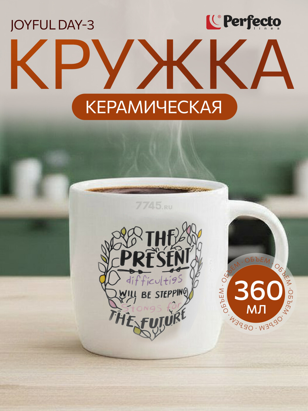 Кружка керамическая PERFECTO LINEA Joyful day-3 360 мл (30-250303) - подходит для подачи горячих и холодных напитков. Керамика отличается высокой экологичностью. Допускается применение при любой температуре: холодильник, разогрев в микроволновой печи. Неустойчива к перепадам температуры. Можно мыть в посудомоечной машине.