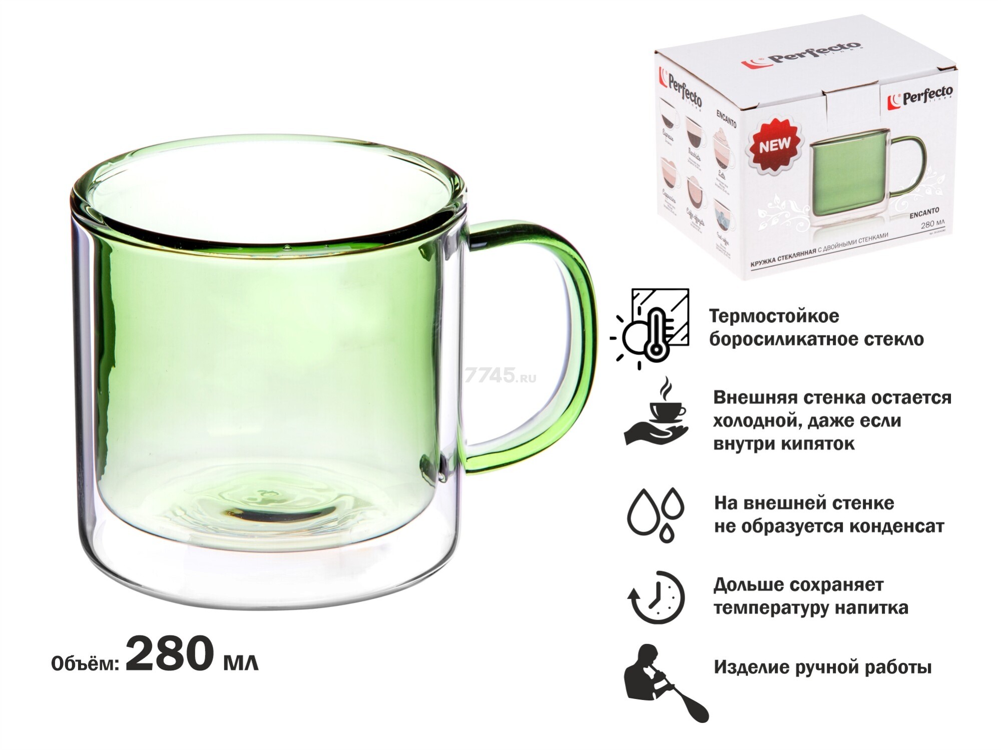 Кружка стеклянная PERFECTO LINEA Encanto с двойными стенками 280 мл лес (30-004280) дольше сохраняет температуру напитка. Горячее будет долго не остывать, а холодные напитки, напротив, не будут становится теплыми. Стакан не будет обжигать руки и деформировать поверхности. Такие способности придают этой кружке двойные стенки и прослойка воздуха, находящаяся между ними. Боросиликатное стекло остается блестящим всегда, ведь оно не подвержено царапинам. Рекомендации: не мыть в посудомоечной машине; не использовать в микроволновой печи; не использовать в духовке; не использовать абразивные чистящие средства.