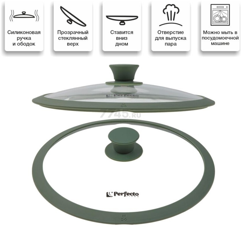 Крышка стеклянная 24 см PERFECTO LINEA Natural Green (25-024322) – яркая, легкая, удобная крышка с современным дизайном. Силиконовые ободки отлично держатся на сковородке, даже когда сковородка мокрая крышка с нее не сползает. Силиконовая ручка на крышке не нагревается и теперь можно подымать крышку и не переживать, что горячо.