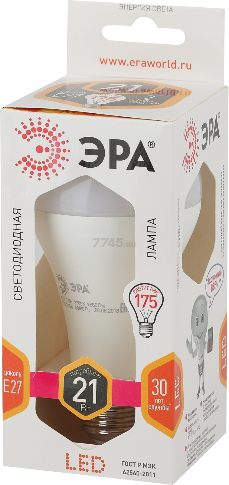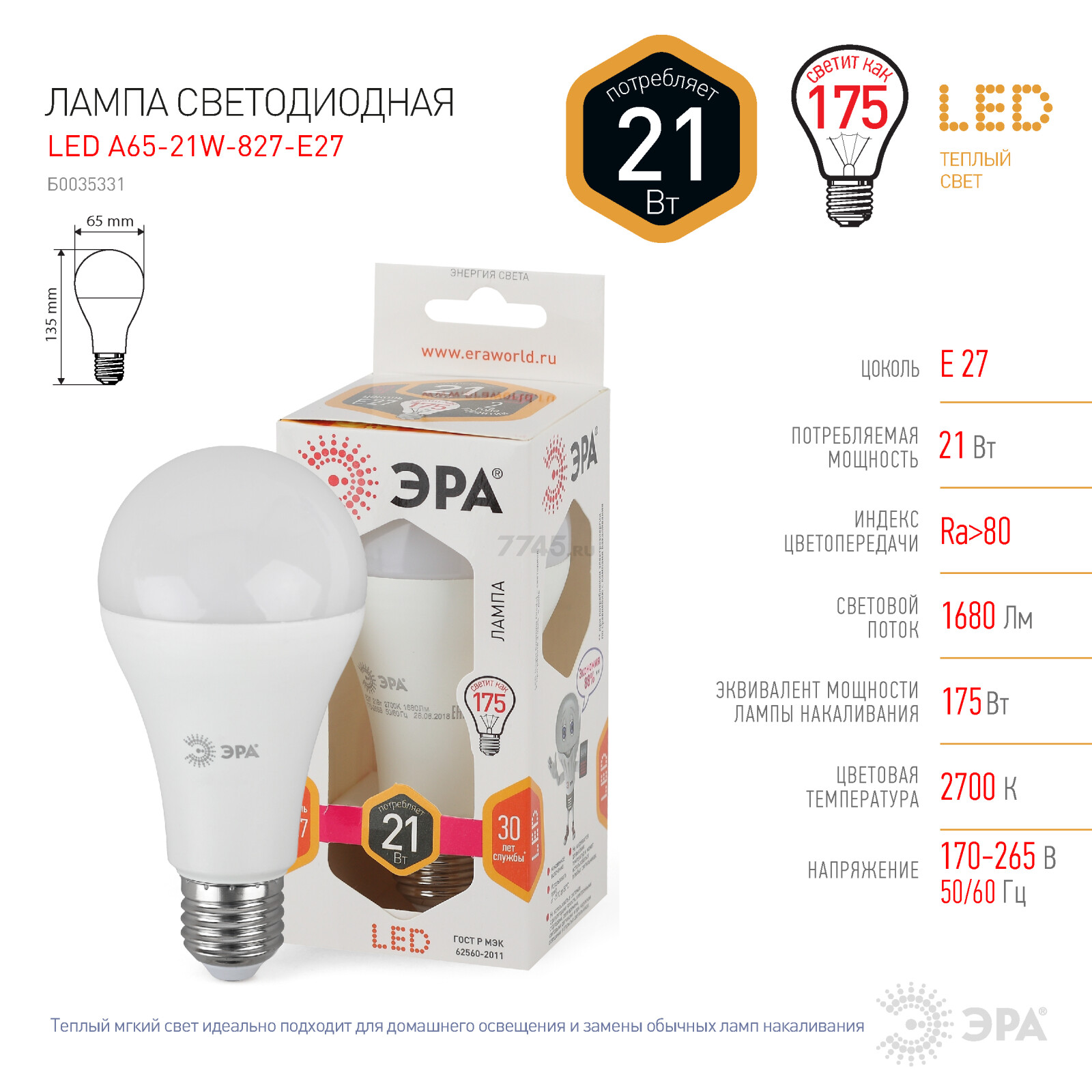 Информация о товаре Лампа светодиодная E27 ЭРА Стандарт A65 21 Вт 2700K