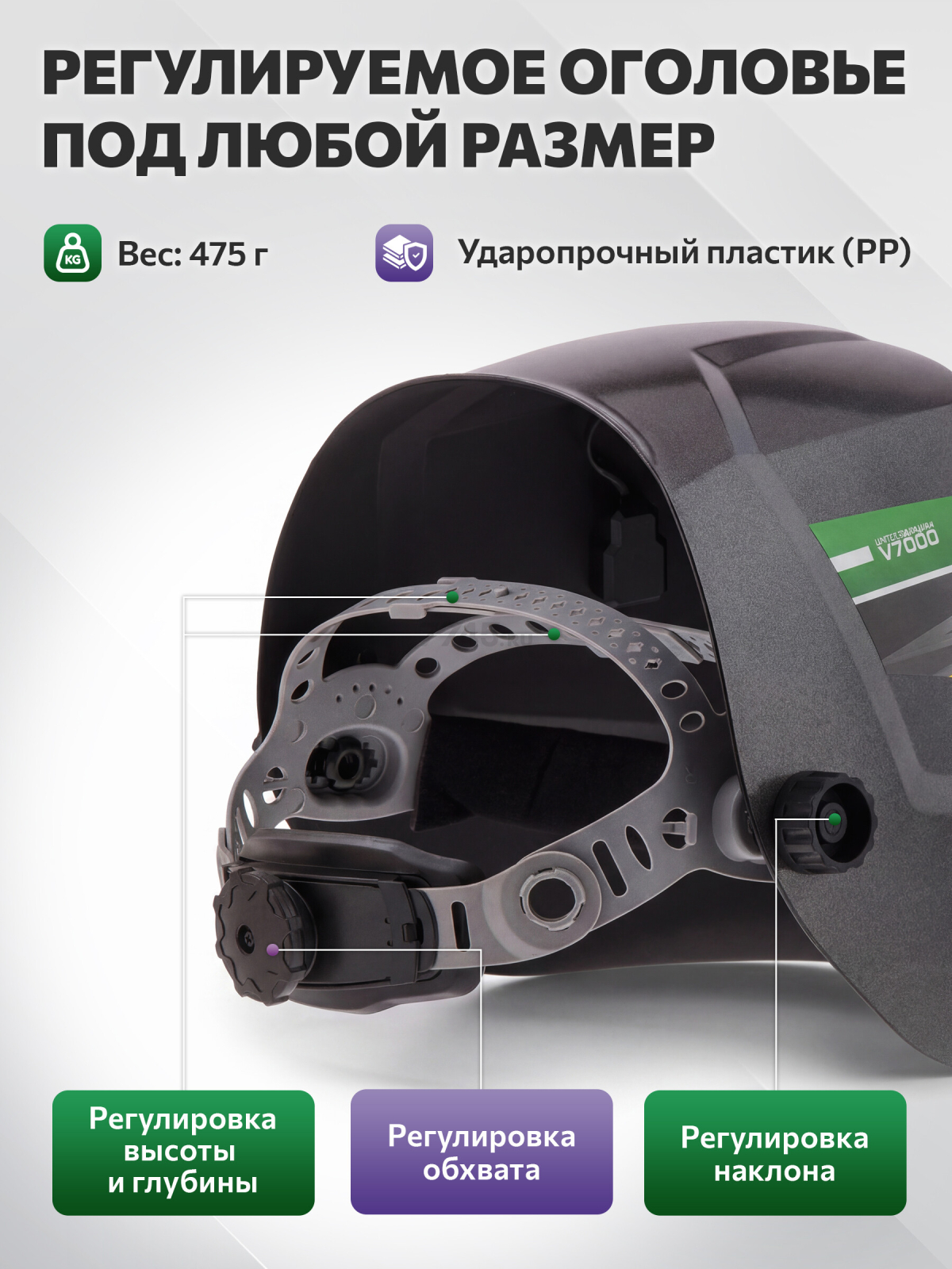 Маска сварочная хамелеон DGM V7000 черный (V7000BL1) — модель профессиональной серии. Оснащена качественным светофильтром с 4 фотосенсорами, что позволяет проводить сварочные работы даже на небольших токах в режиме TIG. Оголовье с большим количеством настроек позволит настроить щиток под любого оператора. Защитное стекло в комплекте.