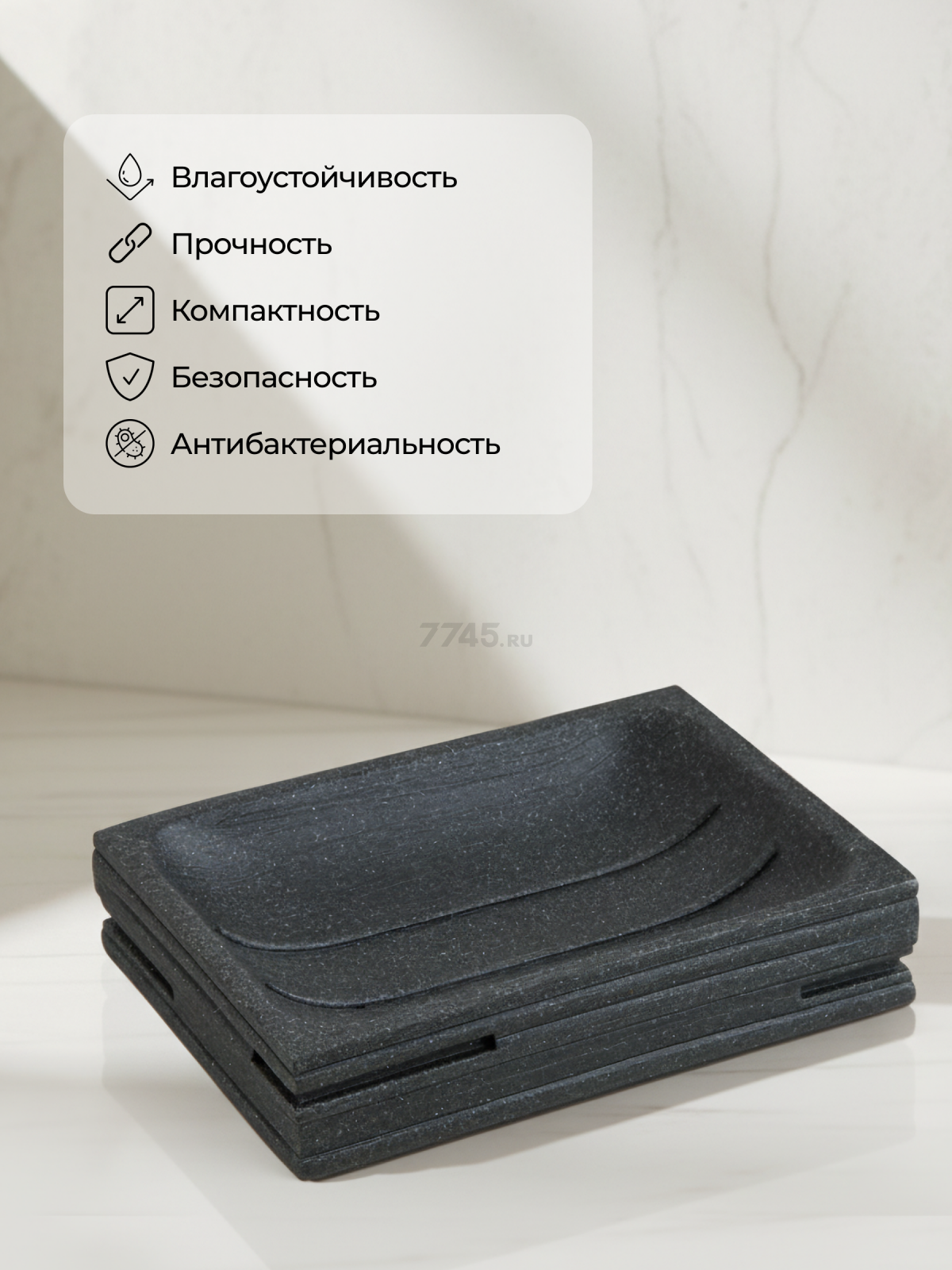 Мыльница PERFECTO LINEA Weathered Sand черная (35-151401) имеет необычный дизайн, созданный с помощью композитного материала: полирезина под натуральный камень. Благодаря такой структуре изделие имеет низкую теплопроводность, приятное на ощупь, а также устойчиво к влаге и повышенным температурам. Преимущества товаров для ванной комнаты из полирезина: