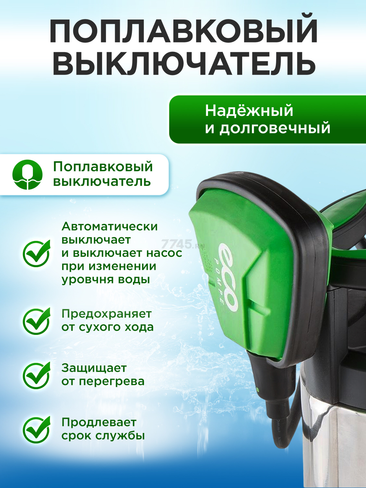 Насос дренажный ECO DI-903 имеет следующие функции: асинхронный двигатель с защитой от перегрузок, автоматическое включение/выключение при помощи поплавкового выключателя, корпус насоса из нержавеющей стали, крыльчатка из технополимера разработана специально для загрязненной воды, клапана деаэрации автоматически развоздушивает полость насоса. Насос не предназначен для перекачивания воды с содержанием песка и прочих абразивных включений.