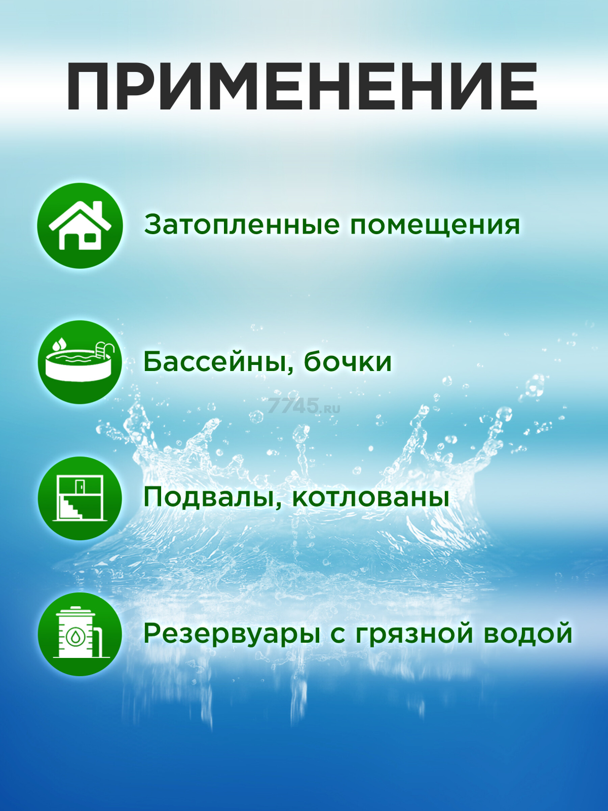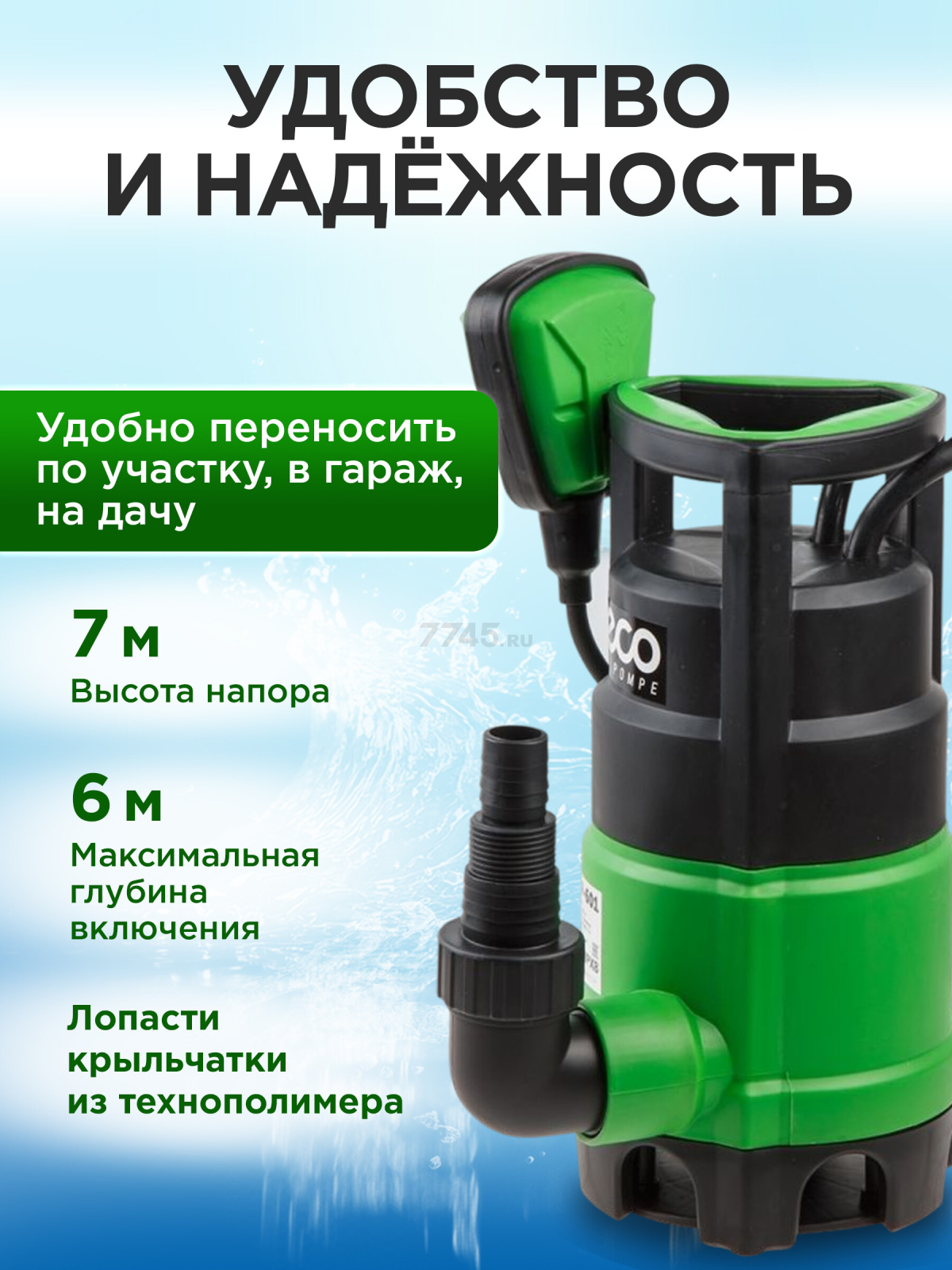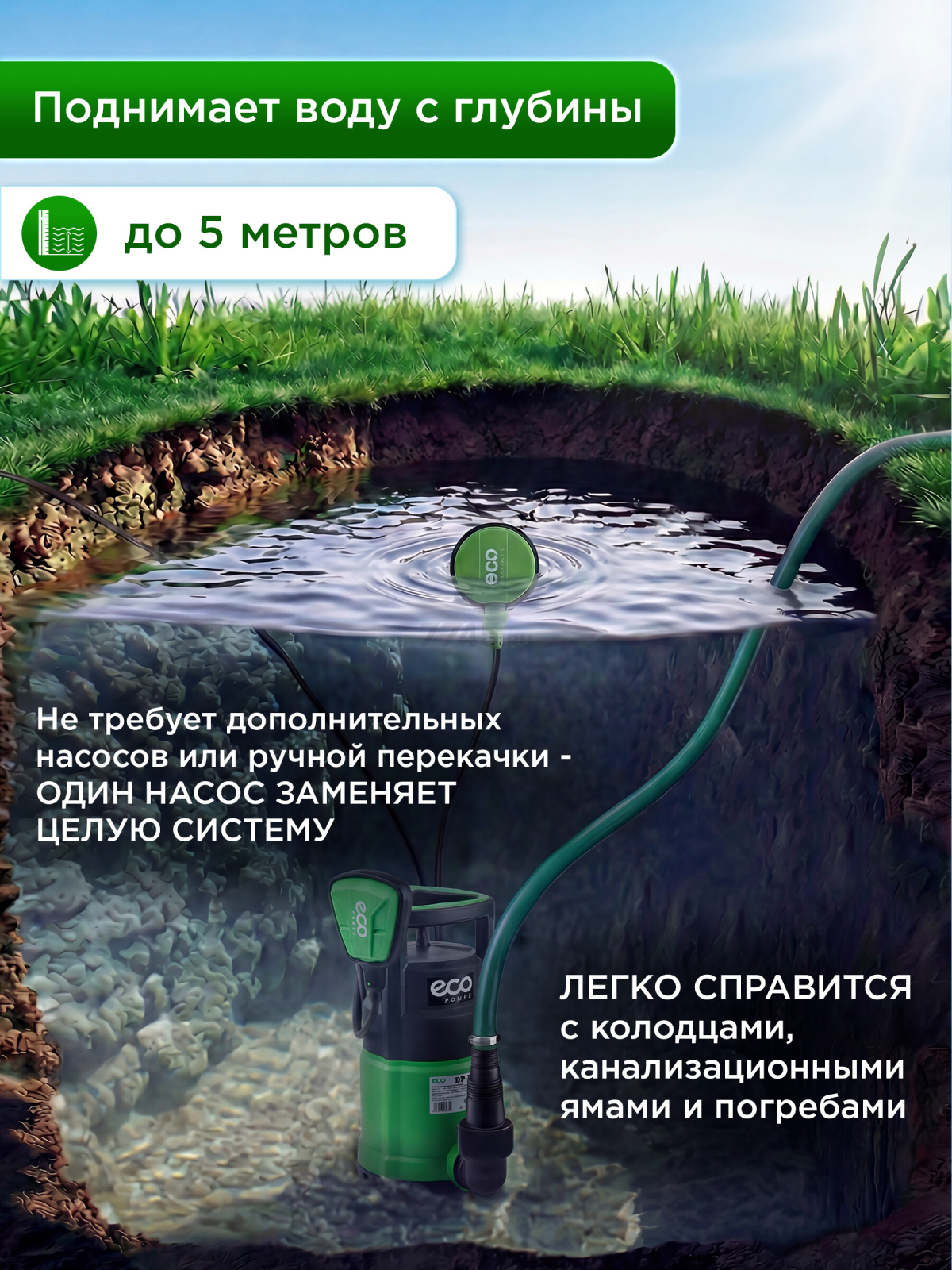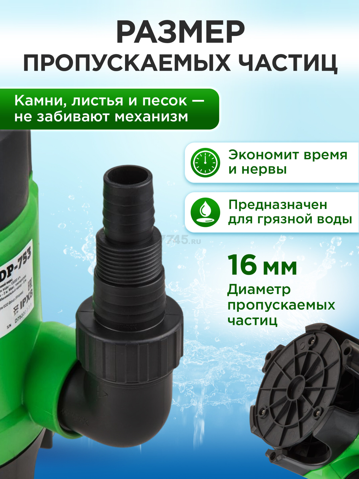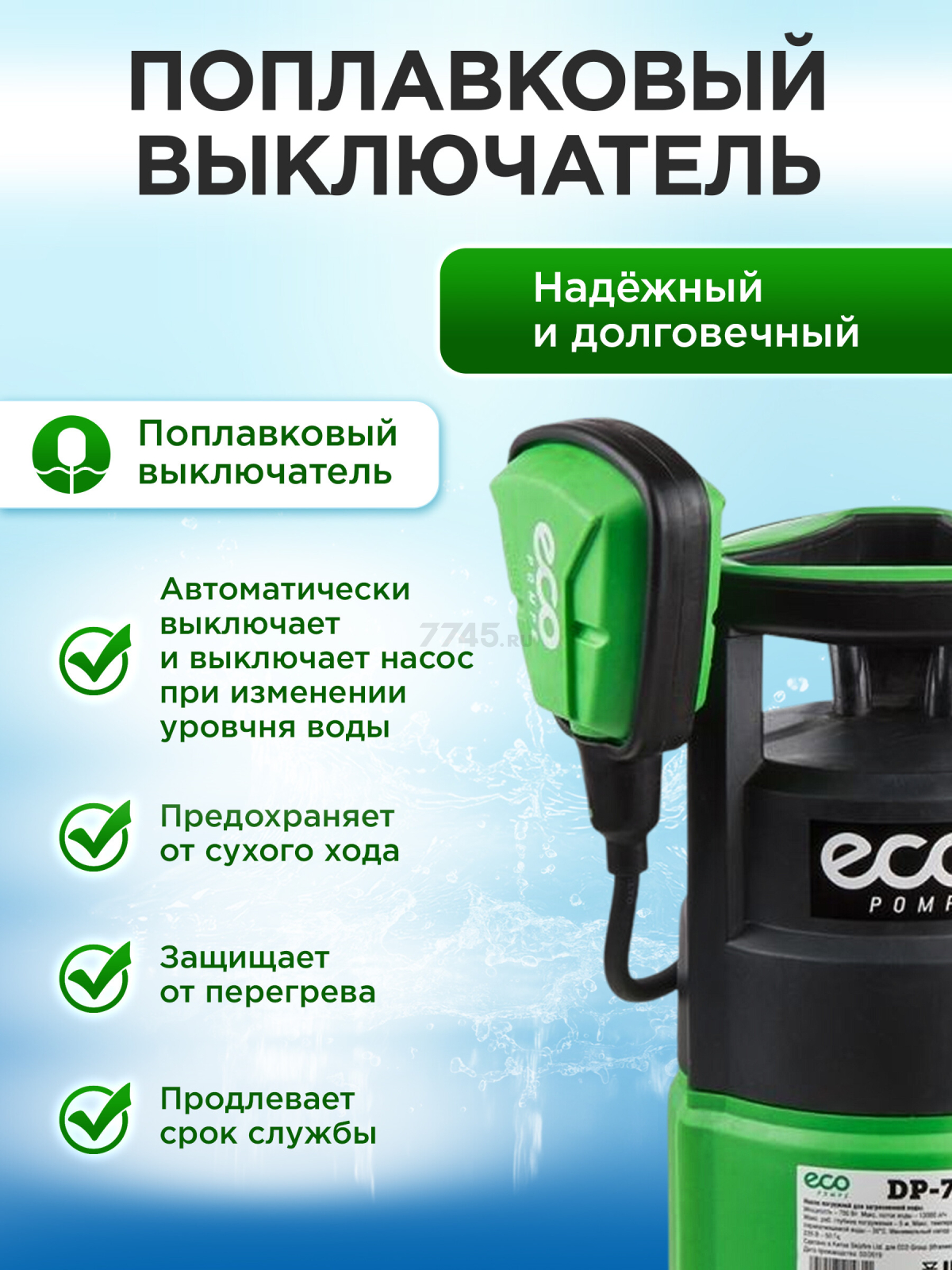 Насос дренажный ECO DP-753 имеет асинхронный двигатель с защитой от перегрузок. Автоматическое включение/выключение происходит при помощи поплавкового выключателя. Лопасти крыльчатки из технополимера разработаны специально для загрязненной воды. Клапана деаэрации автоматически развоздушивает полость насоса.
