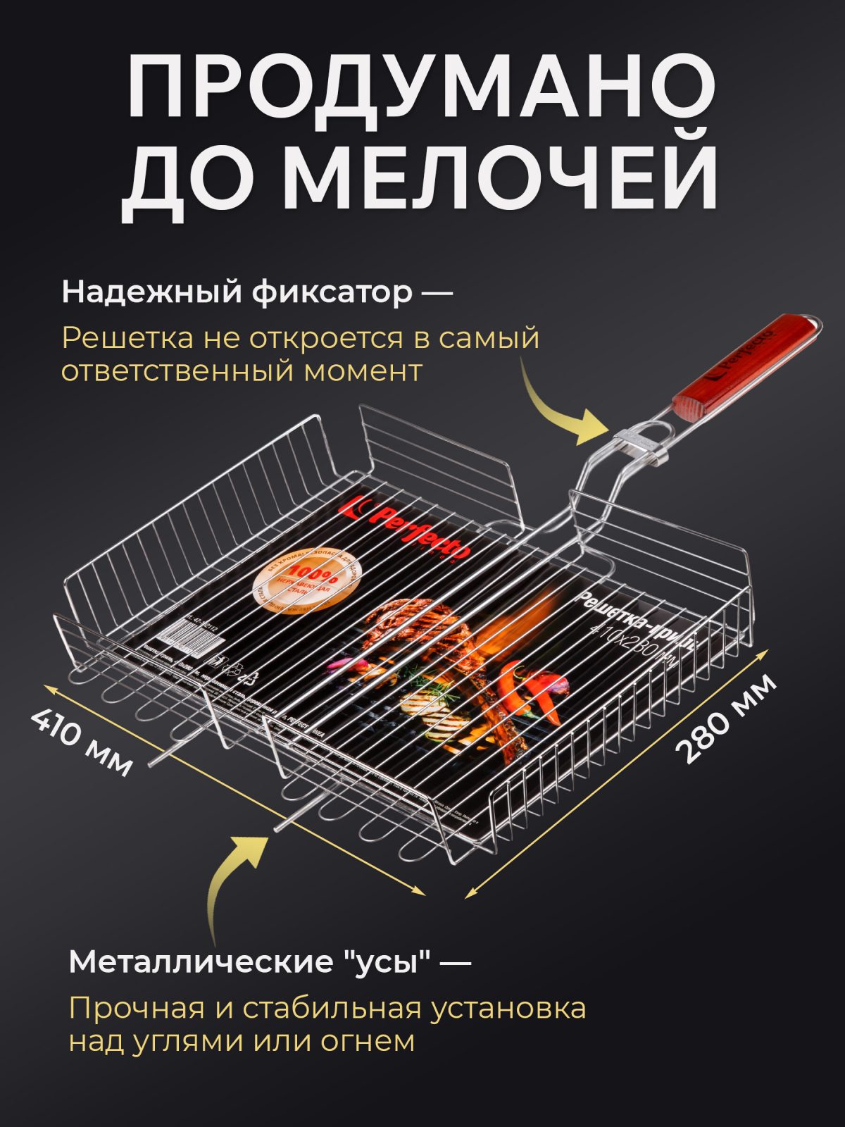 Решетка-гриль 410x280 мм нержавеющая сталь PERFECTO LINEA (47-102112) изготовлена из 100% нержавеющей стали, что делает ее безопасной для здоровья. Используется для запекания мяса, птицы, рыбы и овощей. Прочные стальные прутья от 2-х до 4-х мм толщиной делают решетку более долговечной, а металлические "усы", позволяют надежно разместить над источником тепла. Деревянная вставка на рукоятке, предохранят от ожогов, удобна в руке и имеет привлекательный вид. Надежное кольцо-фиксатор предотвращает открытие решетки в процессе приготовления.