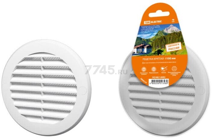 Решетка вентиляционная TDM (SQ1807-0092) – круглая вентиляционная решетка с москитной сеткой, белого цвета, предназначенная для декоративного оформления и защиты отверстий приточно-вытяжной вентиляции. Оснащена фланцем диаметром 100 мм и имеет внешний диаметр 136 мм. Подходит для настенного и потолочного монтажа. Конструкция с наклонными жалюзи предотвращает обратный поток воздуха и попадание насекомых. Крепление осуществляется на клей или с помощью шурупов. Решетка применяется в санузлах, ванных комнатах, кухнях и общественных помещениях, обеспечивая аккуратный внешний вид и эффективную вентиляцию.