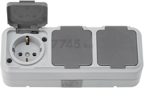 Розетка тройная наружная с заземлением брызгозащищенная BYLECTRICA Пралеска Аква серая (РА16-0132(03)) с установочными размерами (расстояние между отверстиями): 173±0,2х53±0,2 мм. Климатическое исполнение: УХЛ4. Номинальное напряжение: 220..250 В. Сечение присоединяемых проводников, мм²: от 1,5 до 2,5.