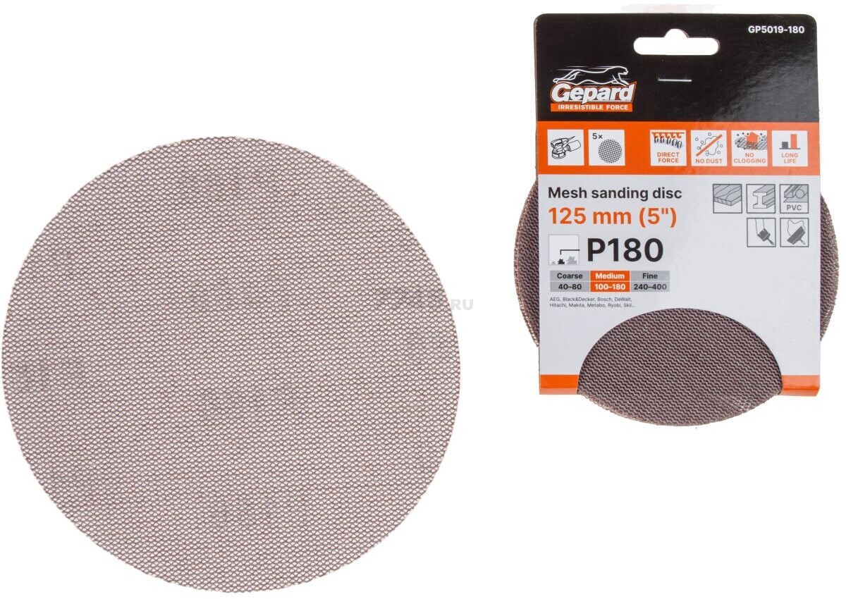 Шлифлист круглый самосцепляющийся 125 мм Р180 GEPARD 5 штук (GP5019-180) на сетчатой основе.