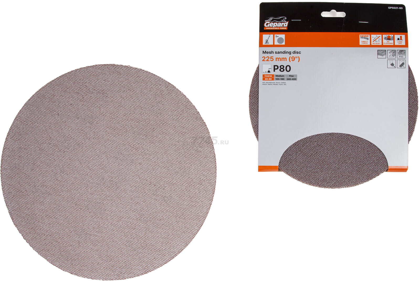 Шлифлист круглый самосцепляющийся 225 мм Р80 GEPARD 5 штук (GP5021-80) на сетчатой основе.