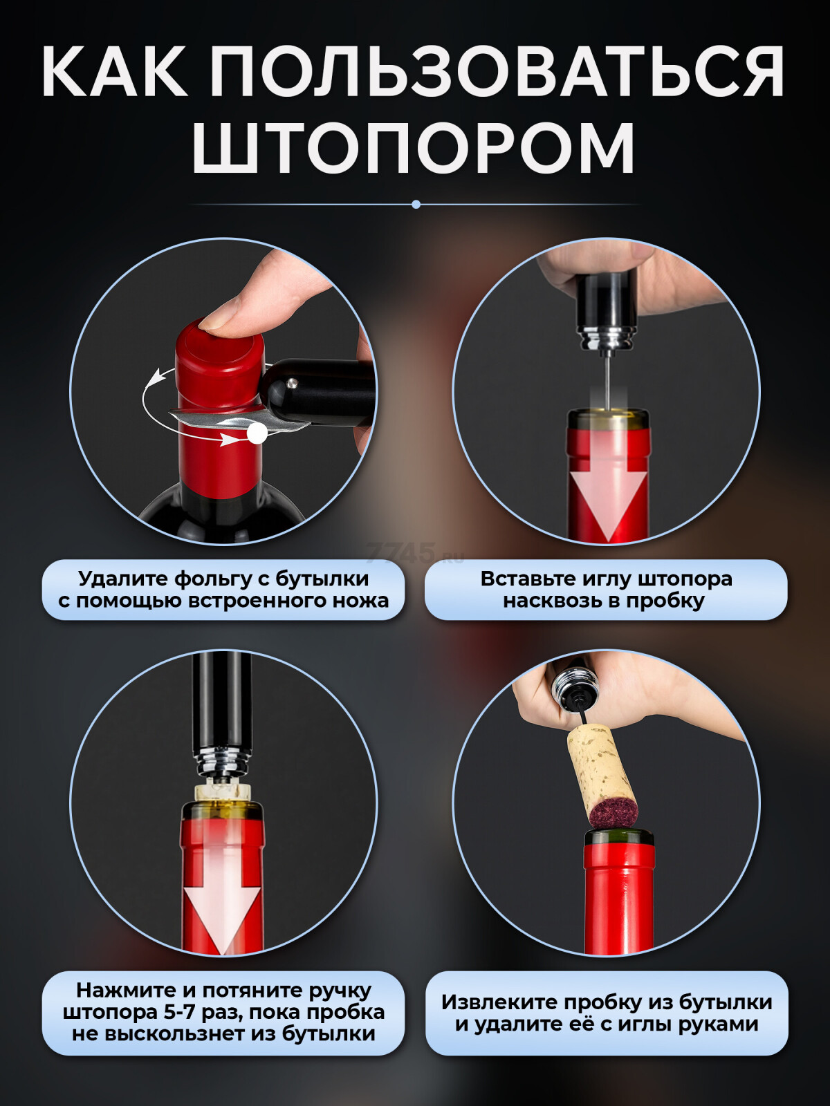 Корпус штопора имеет компактные размеры - 2,1x20,3 см, он удобно ложится в руку и не занимает много места при хранении. В конструкцию также встроен нож для фольги, что позволяет легко и аккуратно удалить защитную обёртку с горлышка перед открытием. Стильный внешний вид и практичность делают этот аксессуар отличным выбором как для домашнего использования, так и в качестве подарка ценителям вина.