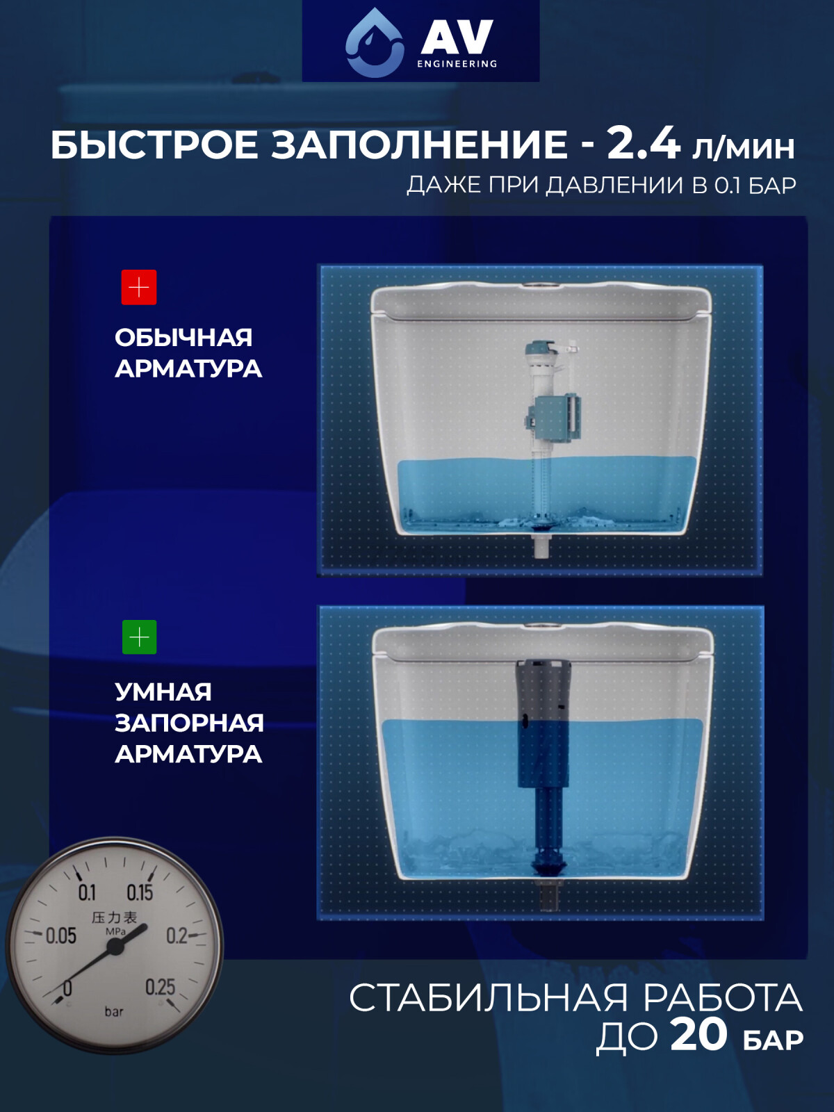 Сливная арматура для унитаза AV ENGINEERING (AVE129700PL) устанавливается в сливной бачок унитаза, обеспечивая регуляцию наполнения и слива воды. Также арматура гарантирует герметичное удерживание воды в бачке. Впускной механизм в арматуре имеет инновационный фильтр с верхней вставкой, который удобно извлекать для очистки. Во время работы весь осадок, проходящий через фильтр, промывается и вытекает из арматуры, таким образом, клапан может работать стабильно даже под мутной водой. Стабильная работа под высоким давлением в 20 Бар.