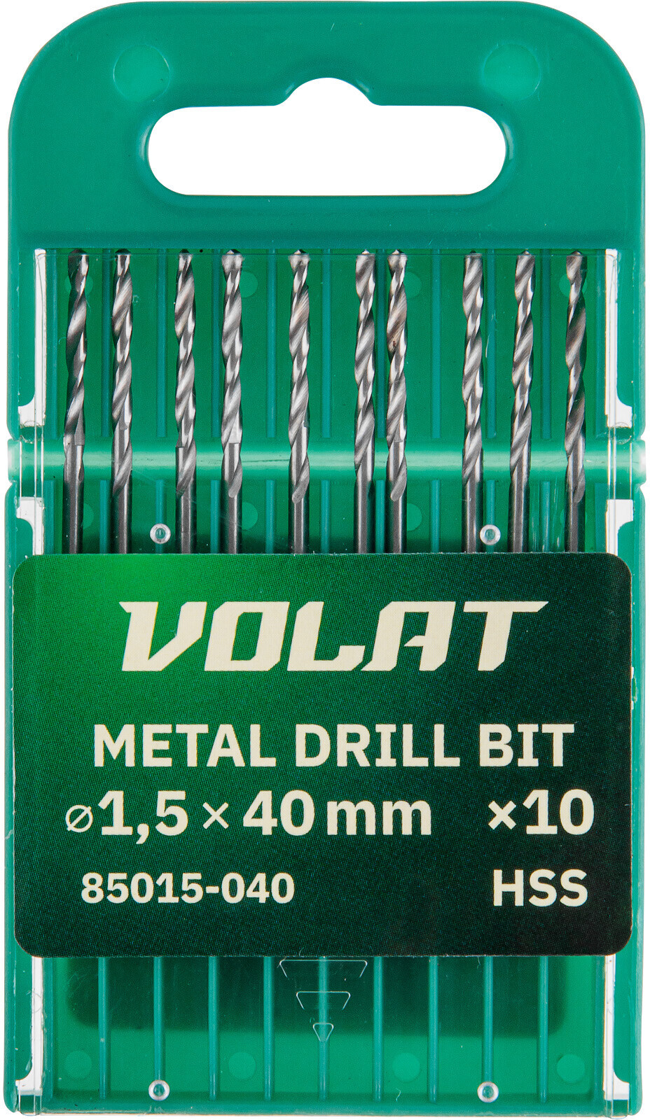 Сверло по металлу 1,5х18х40 мм 10 штук ВОЛАТ (85015-040) из быстрорежущей стали HSS, шлифованное. Подходит для сверления отверстий в низколегированной и конструкционной стали, для чугуна, цветных металлов, твердых пластиков, древесине; в меньшей степени для легированной стали.