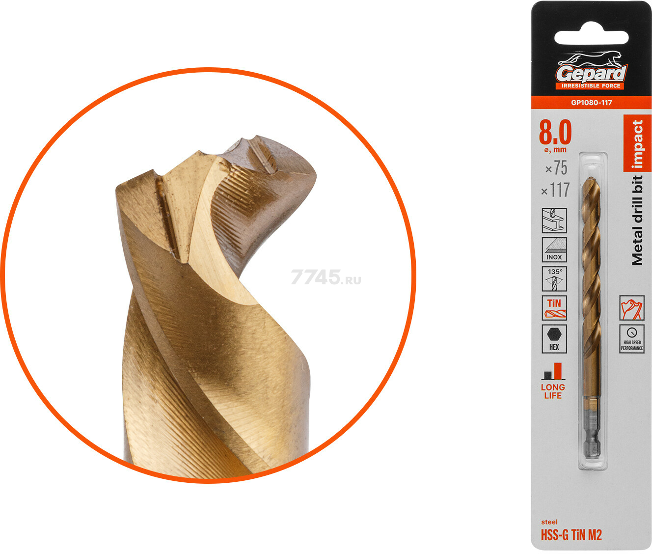 Описание товара Сверло по металлу спиральное 8х75х117 мм GEPARD HSS-G TIN (GP1080-117)