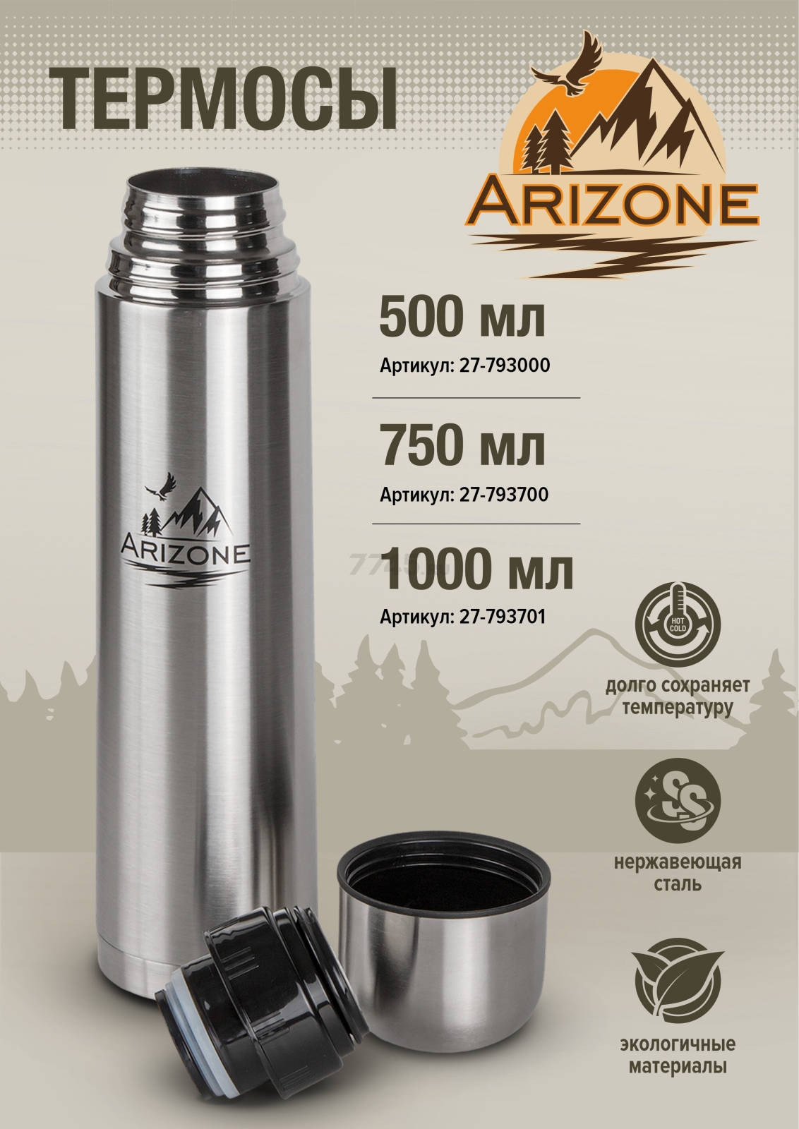Описание товара Термос ARIZONE 0,5 л сталь (27-793000)