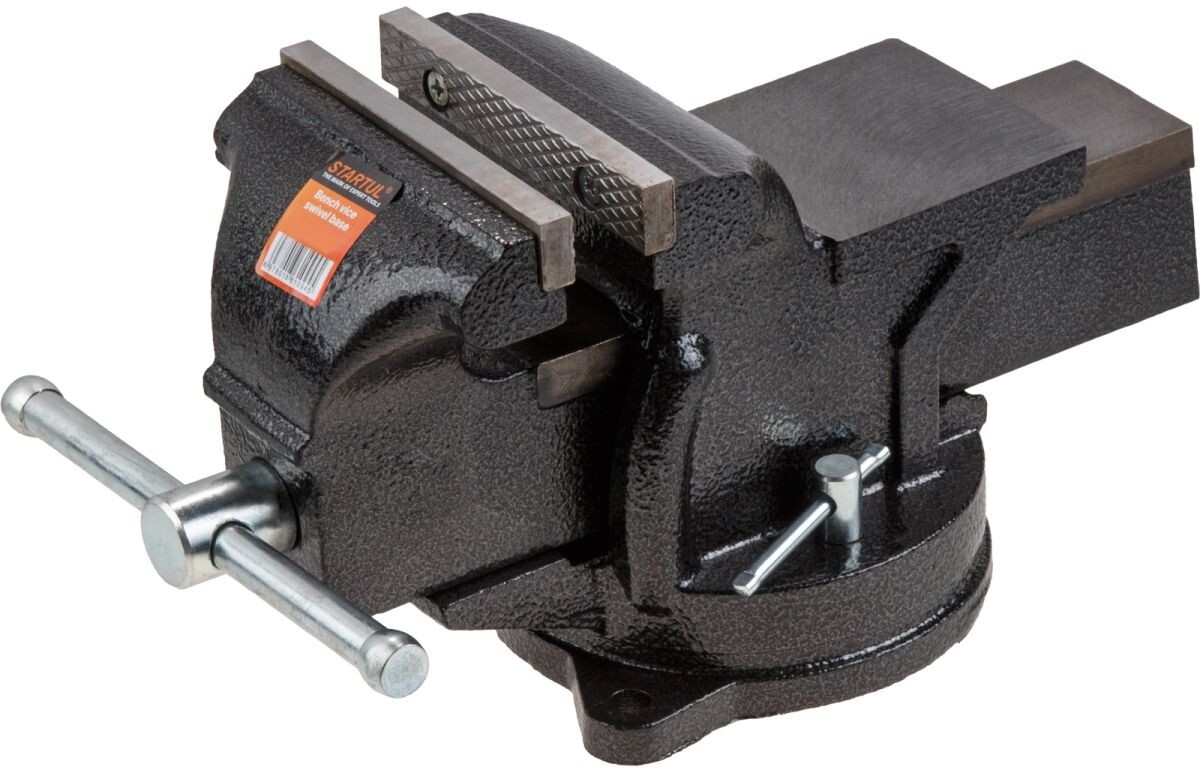 Тиски слесарные 150 мм поворотные STARTUL Profi (ST9600-150) - поворотные тиски предназначены для надежной и быстрой фиксации различных деталей при их ручной и механической обработке. Материал изготовления: высокопрочный чугун, имеющий графитные включения сфероидальной формы.